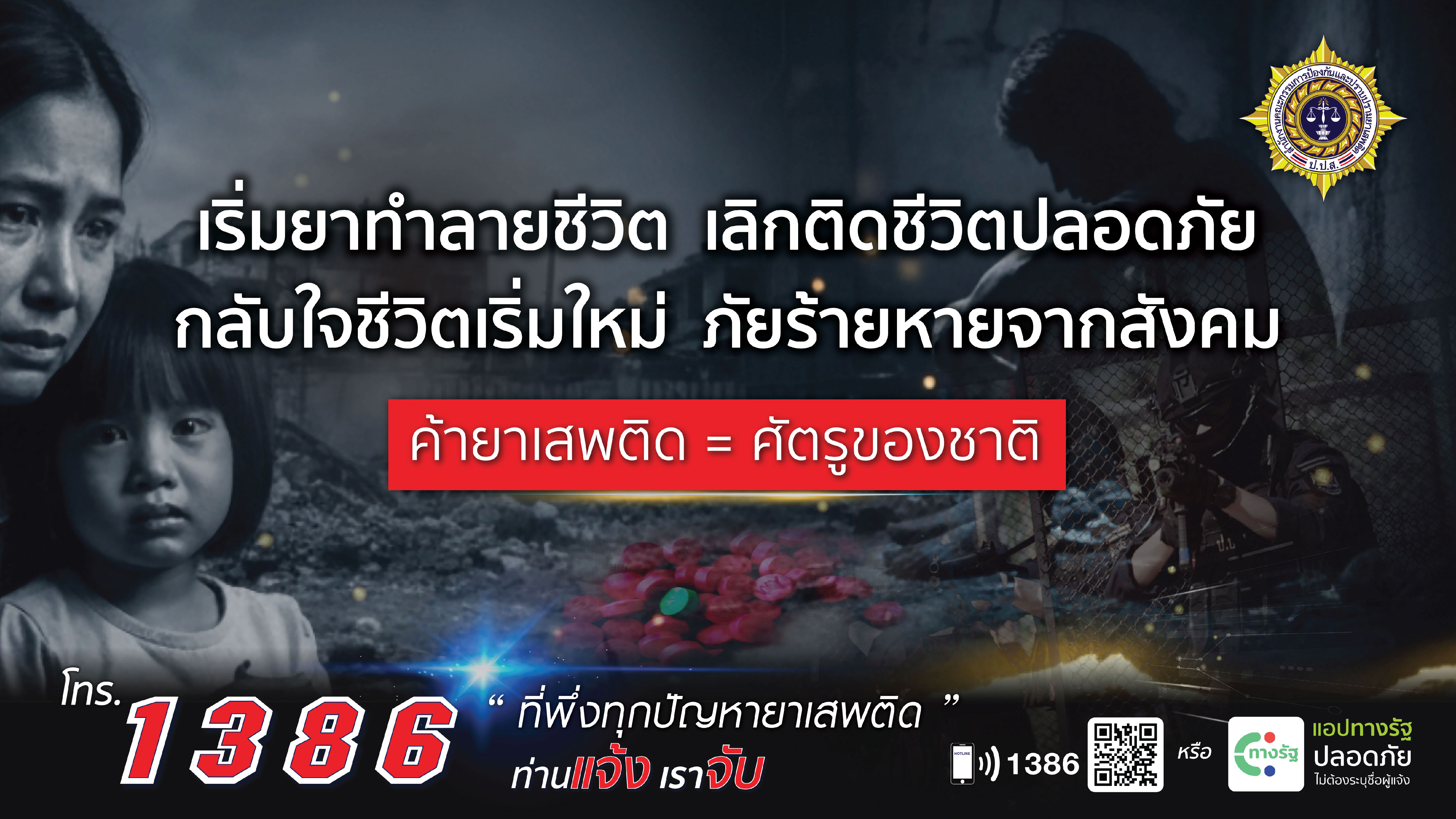 วันพุธ, 14 มกราคม 2569 09:33ยาเสพติดเข้ามาใกล้ตัวเราทุกทีเพื่อความปลอดภัยของลูกหลานและครอบครัว จำไว้ให้มั่น ไม่เสพ ไม่ค้า ไม่บ้า และไม่ติดคุก หากพบเห็นเบาะแส หรือต้องการความช่วยเหลือเรื่องยาเสพติด โทรหาเราได้ที่ สายด่วน ป.ป.ส. 1386 'ที่พึ่งทุกปัญหายาเสพติด' หรือแจ้งผ่านแอปพลิเคชัน 'ทางรัฐ' ก็ได้ ปลอดภัย ไม่ต้องระบุชื่อผู้แจ้ง จำไว้นะคะ... ท่านแจ้ง เราจับ เพื่อชุมชนที่น่าอยู่ของเรา