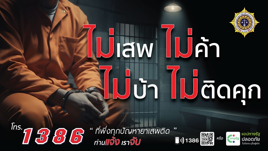 จำไว้ให้มั่น ไม่เสพ ไม่ค้า ไม่บ้า และไม่ติดคุก หากพบเห็นเบาะแส หรือต้องการความช่วยเหลือเรื่องยาเสพติด โทรหาเราได้ที่ สายด่วน ป.ป.ส. 1386 'ที่พึ่งทุกปัญหายาเสพติด' หรือแจ้งผ่านแอปพลิเคชัน 'ทางรัฐ'