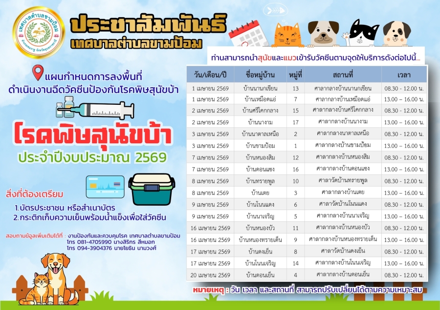 ประกาศเทศบาลตำบลขามป้อม เรื่อง แผนกำหนดการลงพื้นที่ดำเนินงานฉีดวัคซีนป้องกันโรคพิษสุนัขบ้า ประจำปีงบประมาณ 2569 สอบถามข้อูลเพิ่มเติมได้ที่ งานสาธารณสุขและสิ่งแวดล้อม เทศบาลตำบลขามป้อม โทร 081-4705990 นางสิริกร สีหมอก,โทร094-3904376 นายโยธิน นามวงศ์