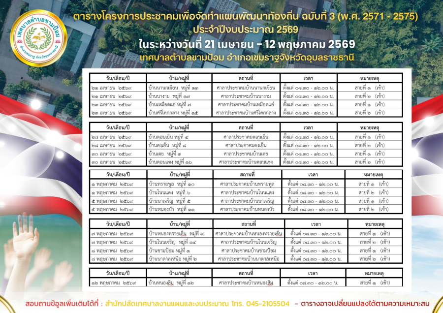 วันอังคาร, 21 เมษายน 2569 09:04?? ประกาศเทศบาลตำบลขามป้อม ?? เรื่อง การประชาคมเพื่อจัดทำแผนพัฒนาท้องถิ่น ฉบับที่ 3 (พ.ศ. 2571 - 2575) ประจำปีงบประมาณ 2569 ในระหว่างวันที่ 21 เมษายน - 12 พฤษภาคม 2569 ตามที่เทศบาลตำบลขามป้อม ได้กำหนดการจัดการประชุมประชาคมหมู่บ้าน เพื่อจัดทำ/ทบทวน/เพิ่มเติม/เปลี่ยนแปลงแผนพัฒนาท้องถิ่น และเพื่อบูรณาการจัดทำแผนหมู่บ้าน แผนพัฒนาตำบล ให้ประชาชนได้รับทราบถึงการประชาคมหมู่บ้านอย่างถูกต้องตามขั้นตอน และให้ประชาชนในตำบลขามป้อม มีส่วนร่วมแสดงความคิดเห็นกับหน่วยงานภาครัฐที่เกี่ยวข้อง เกี่ยวกับปัญหาสำคัญในหมู่บ้านและความต้องการของประชาชนอย่างแท้จริง นั้น ในการนี้ จึงขอประกาศปฏิทินกำหนดการในจัดประชุมประชาคมหมู่บ้าน ทั้ง 17 หมู่บ้านในเขตเทศบาลตำบลขามป้อม ดังต่อไปนี้