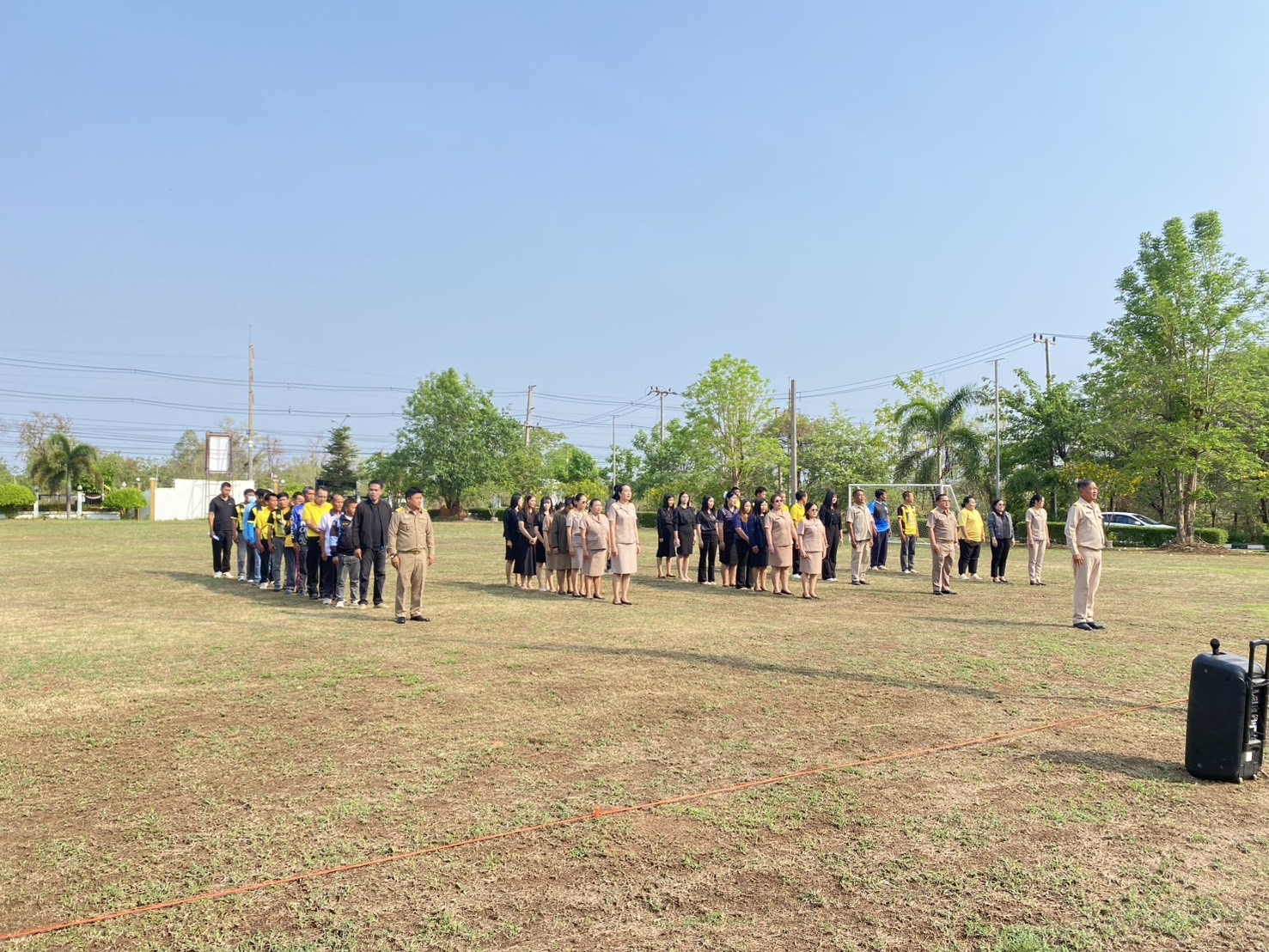 กิจกรรมเคารพธงชาติและร้องเพลงชาติสวดมนต์ไหว้พระ เพื่อแสดงความจงรักภักดีต่อชาติ ศาสนา และสถาบันพระมหากษัตริย์ สำนักงานเทศบาลตำบลขามป้อม วันจันทร์ที่ 27 เมษายน 2569