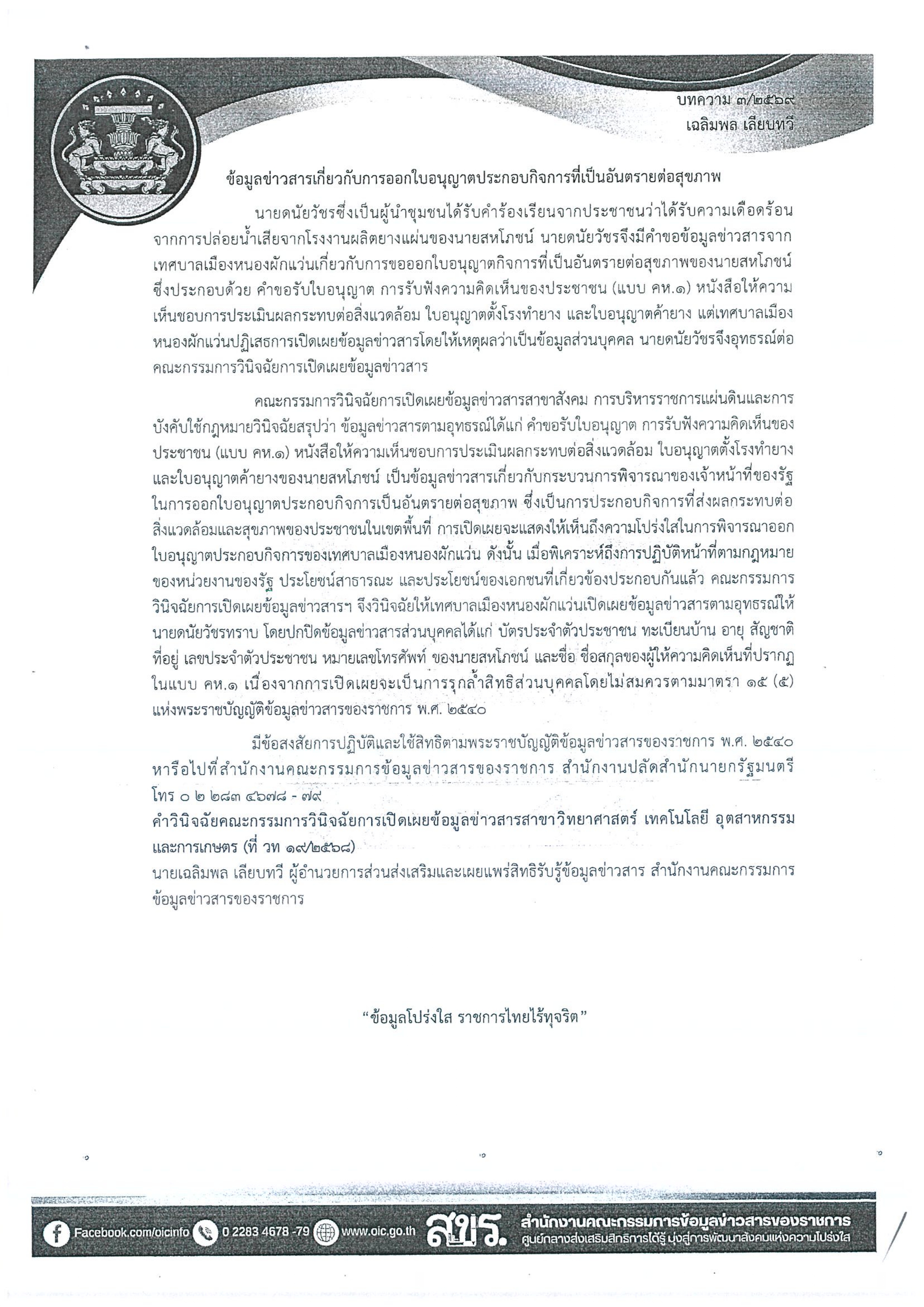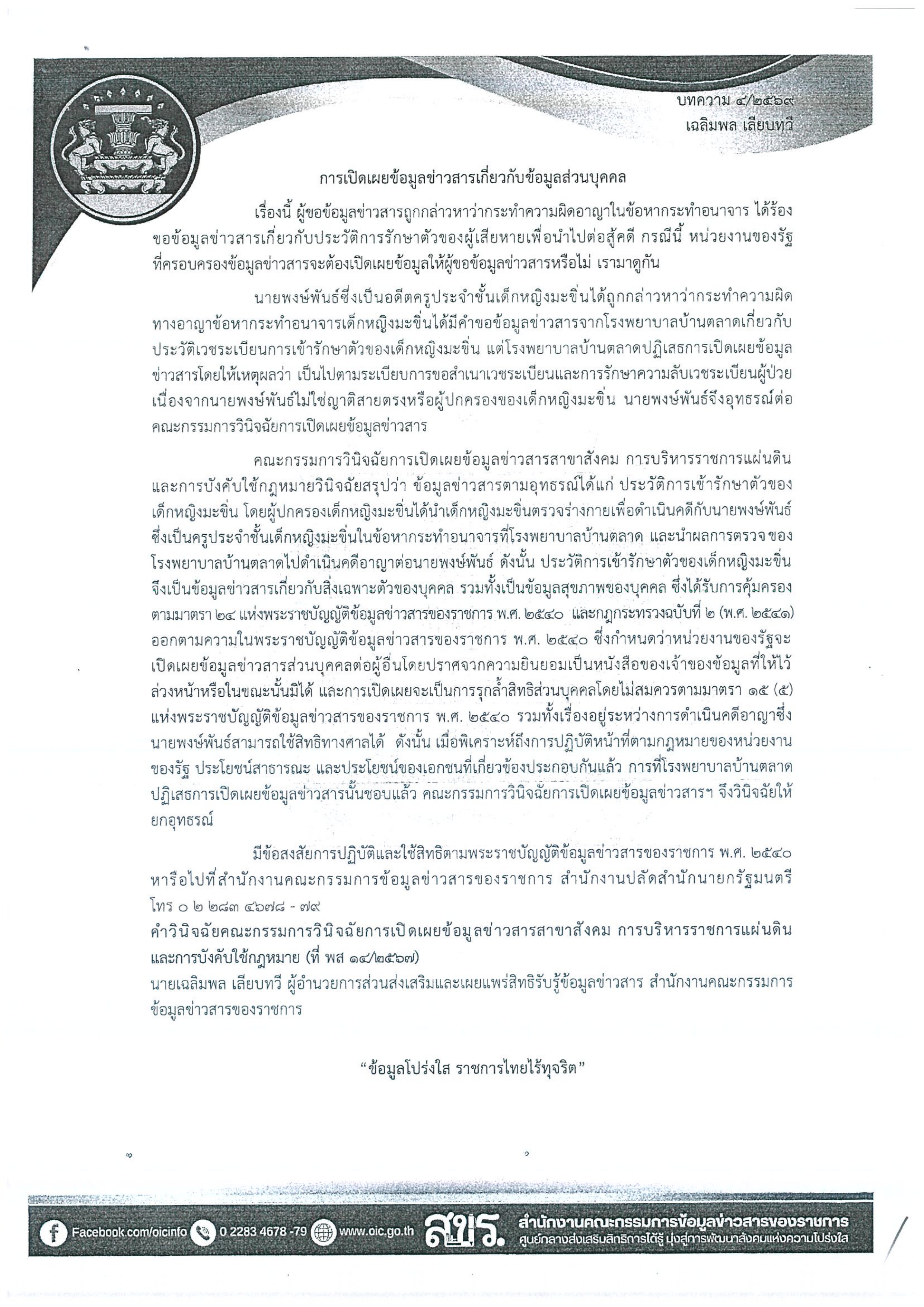 บทความสรุปประเด็นคำวินิจฉัยของคณะกรรมการเปิดเผยข้อมูลข่าวสารและประเด็นข้อหารือ