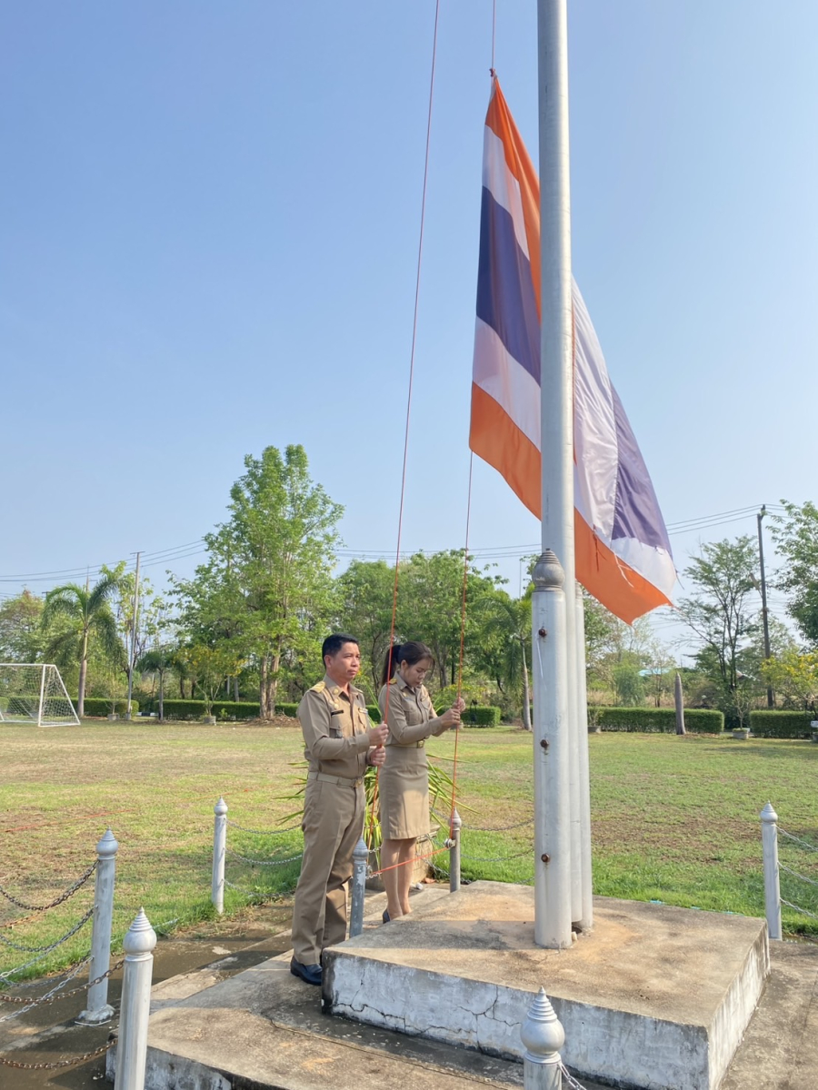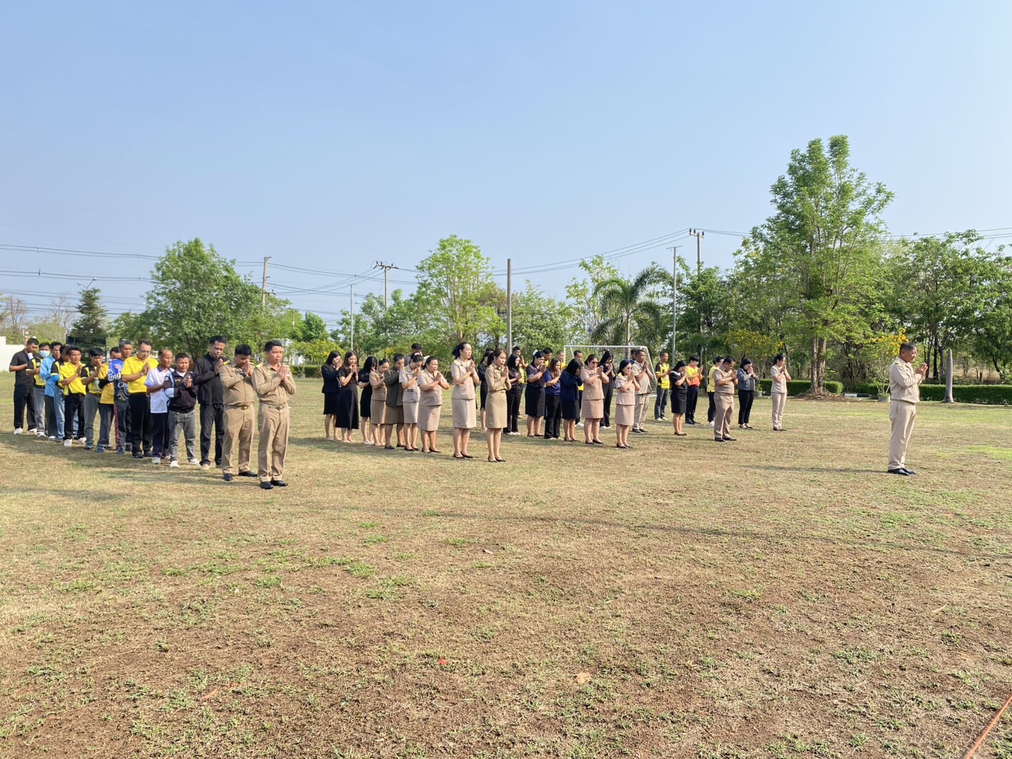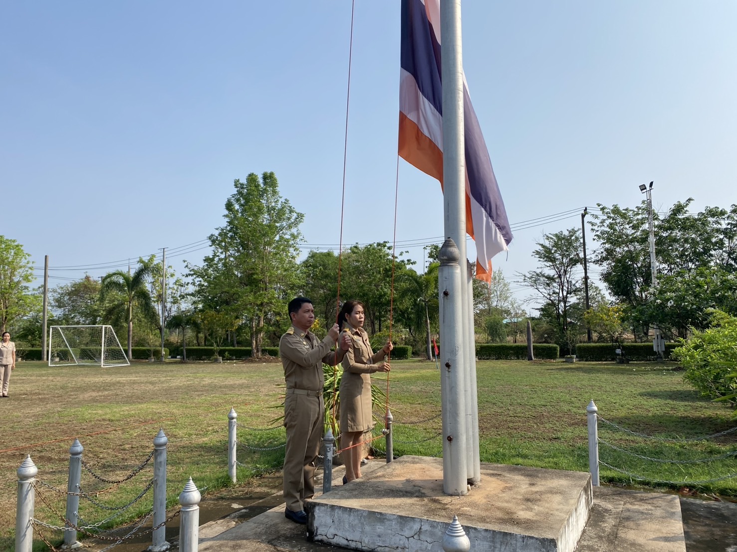 กิจกรรมเคารพธงชาติและร้องเพลงชาติสวดมนต์ไหว้พระ เพื่อแสดงความจงรักภักดีต่อชาติ ศาสนา และสถาบันพระมหากษัตริย์ สำนักงานเทศบาลตำบลขามป้อม วันจันทร์ที่ 27 เมษายน 2569